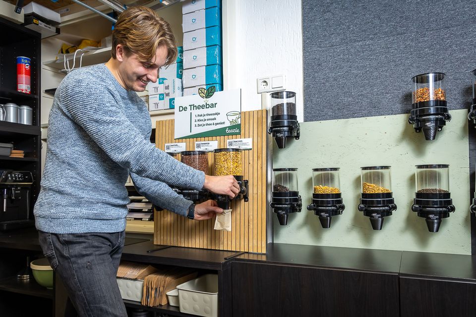 Het concept werkt simpel: kies een smaak, pak een theezakje en vul deze met precies de juiste hoeveelheid thee dankzij de slimme theedispenser. Teazie biedt zakelijke thee-abonnementen waarbij zij al het werk uit handen nemen. Zo verzorgen zij de installatie van de theebar, het maandelijkse onderhoud en het wisselen van de thee. Naast de kwaliteit en het gemak, speelt ook de duurzaamheid een belangrijke rol. ‘We besparen 95% op verpakkingsmateriaal ten opzichte van reguliere theezakjes. Onze theezakjes zijn gemaakt van maisvezel en katoen en zijn 100% biologisch afbreekbaar’, zegt Hovanesian.