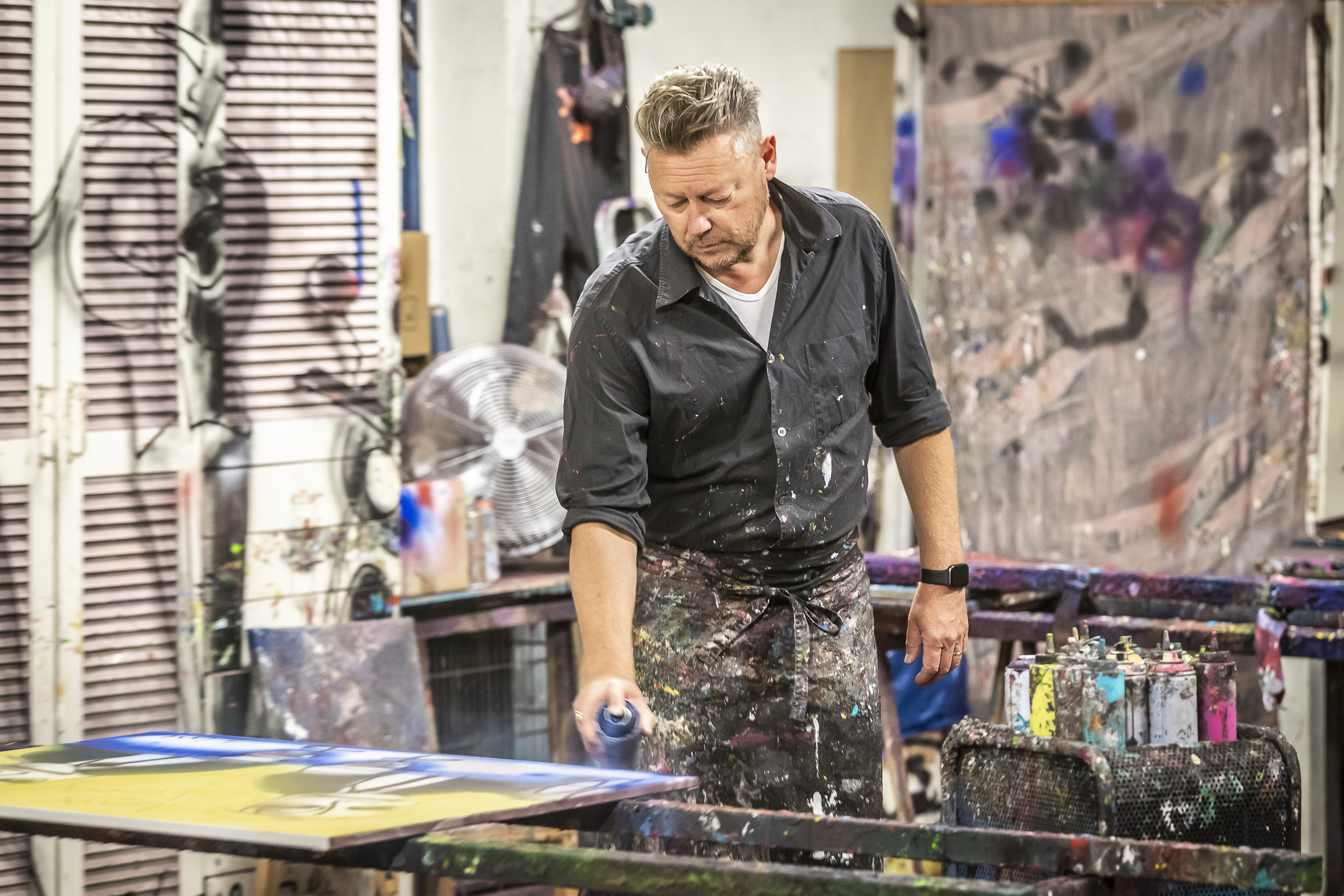 In de werkplaats van de Roosendaalse kunstenaar Geoffrey Wijn (53) staan zo’n 500 schilderijen maar vind je ook meubels, jassen, schoenen en een scooter die tot kunstobject zijn gemaakt. Het meeste plezier haalt Wijn uit zijn live art. ‘Daar heb ik een hele show omheen gebouwd. Je hebt alleen maar dít moment en dat maak ik zo leuk mogelijk.’