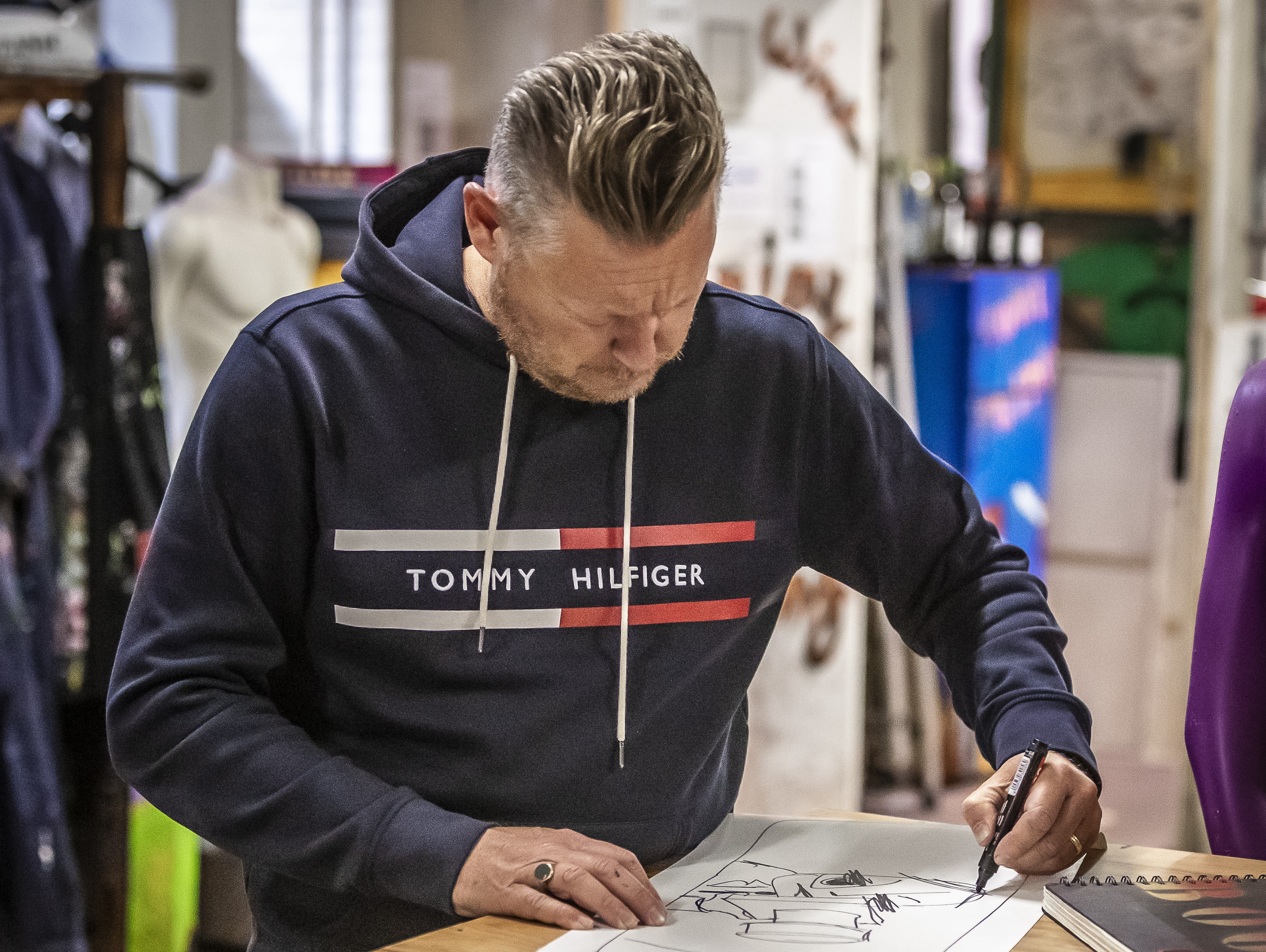 ‘Eigenlijk ben ik mijn hele leven al kunstenaar. Vroeger op school hadden we van die leren schooltassen en het was hip om die met pen te versieren. Ik kon leuke dingen tekenen dus iedereen vroeg mij iets op hun tas te tekenen. Ik ben altijd met tekenen bezig geweest maar heb de exacte opleiding bouwkunde gedaan. Toen een vriend mij meevroeg naar de open dag van de kunstacademie, zag ik direct: dit is mijn ding. Toch koos ik ook daar voor een exacte studie: architectonische vormgeving.’