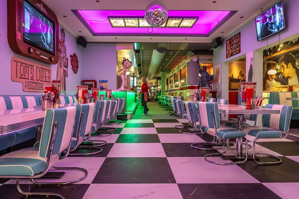 Wanneer je de deur opent, stap je de wereld van Amerika uit de jaren ’50 binnen. The Golden Days toen Coca Cola, Rock ’n Roll en Cadillac de harten van mensen over heel de wereld veroverden. In het restaurant is het fiftiesthema tot in detail vertaald naar een speels en stijlvol geheel. De Amerikaanse schoolbus als uitgiftepunt van de keuken, het treinstel als knipoog naar de authentieke Amerikaanse diner en de herkenbare leren bankjes en barkrukken vormen een indrukwekkend decor. Maar vergis je niet, dit retroconcept gooit hoge ogen omdat ze juist vooruitstrevend zijn in hun manier van ondernemen.